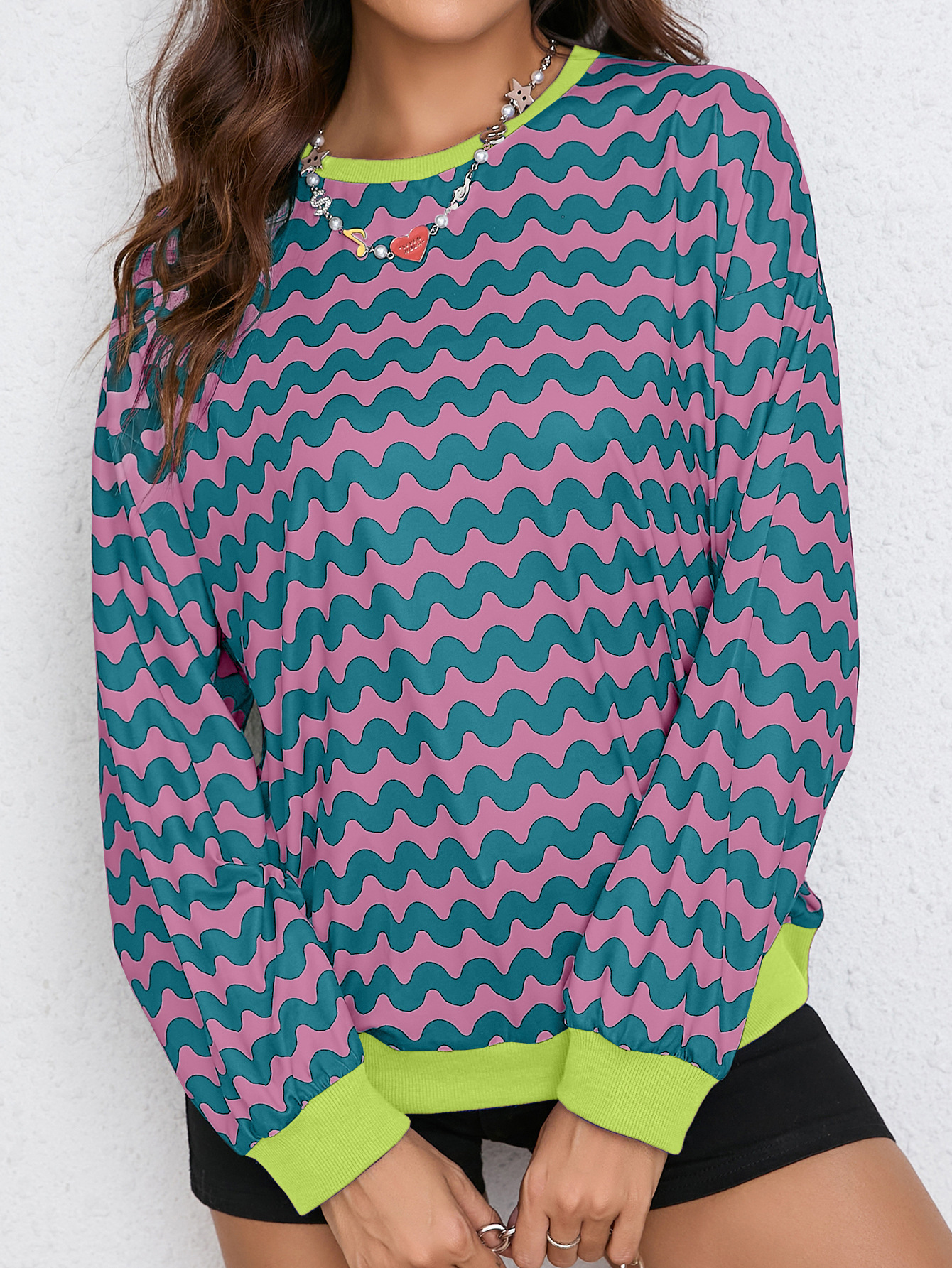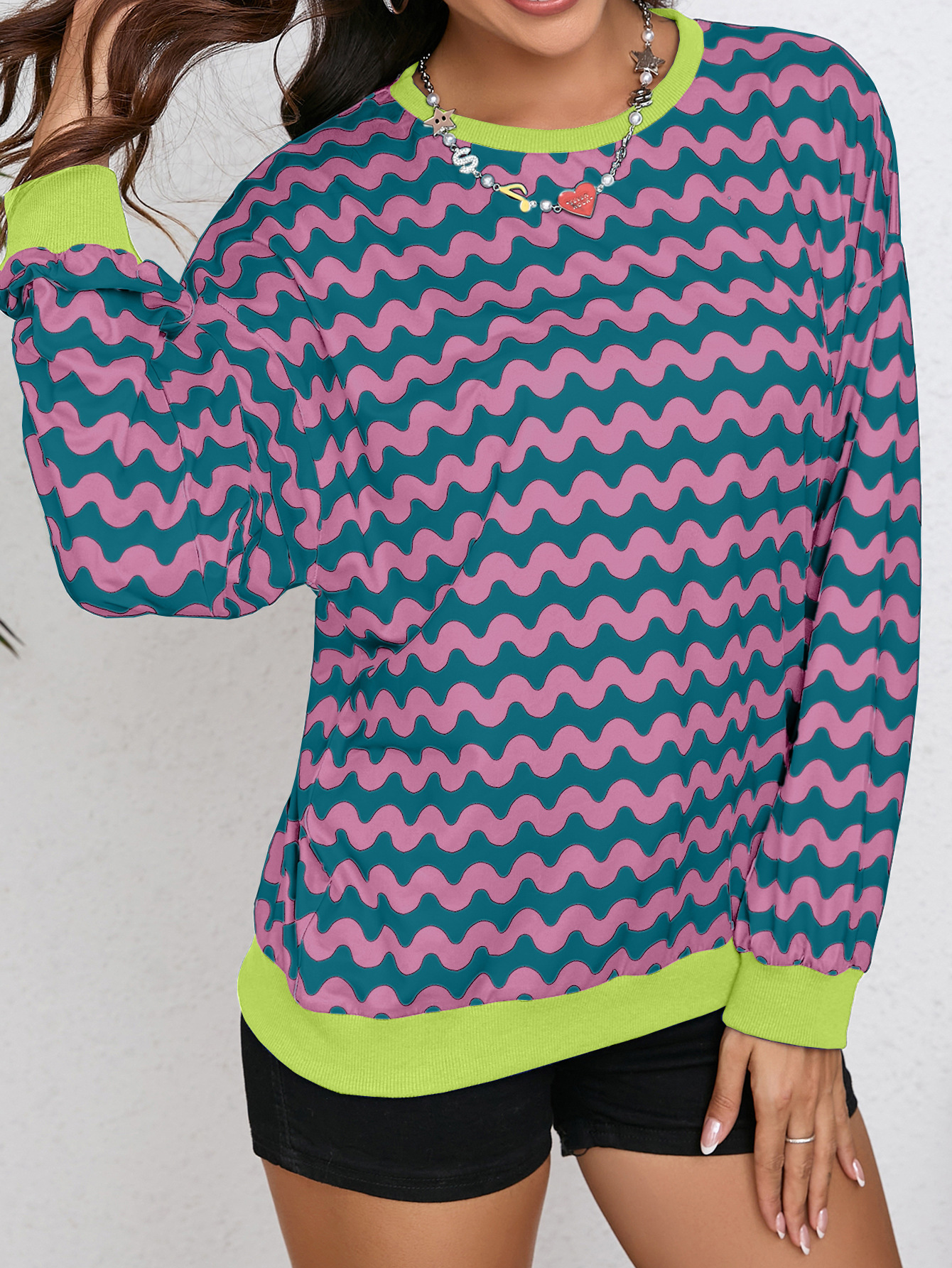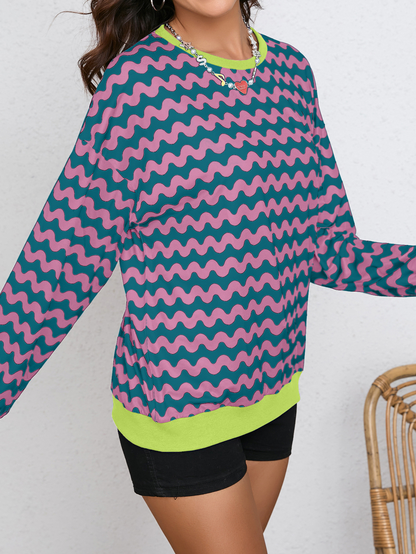 Wave-patterned Color-Block Long-Sleeve Crewneck Loose-Fit Pullover Sweatshirt