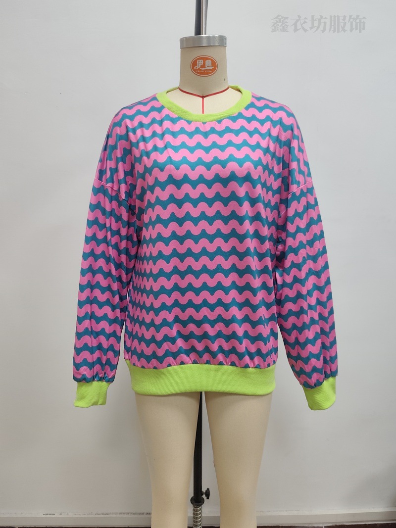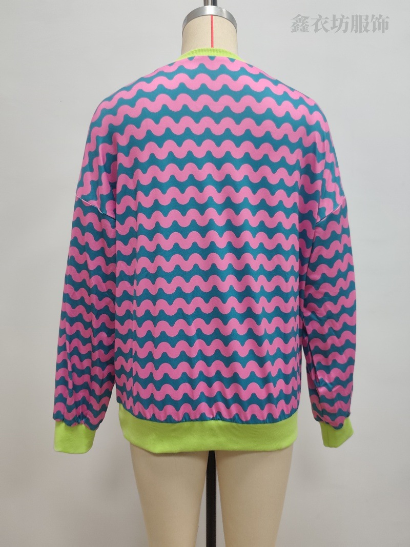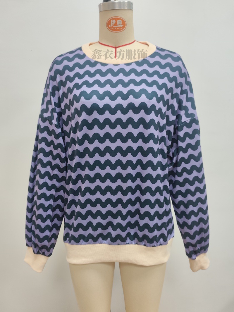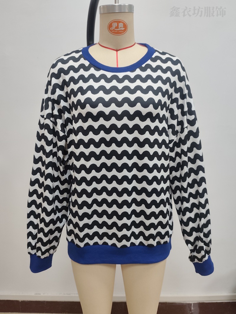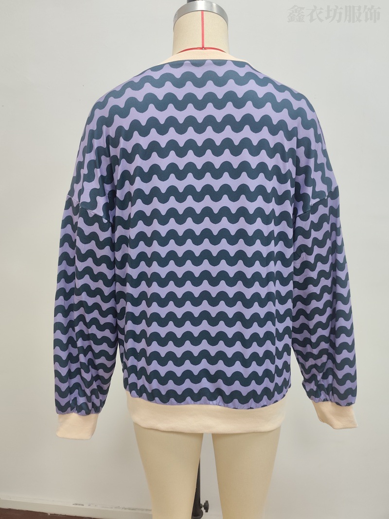 Wave-patterned Color-Block Long-Sleeve Crewneck Loose-Fit Pullover Sweatshirt
